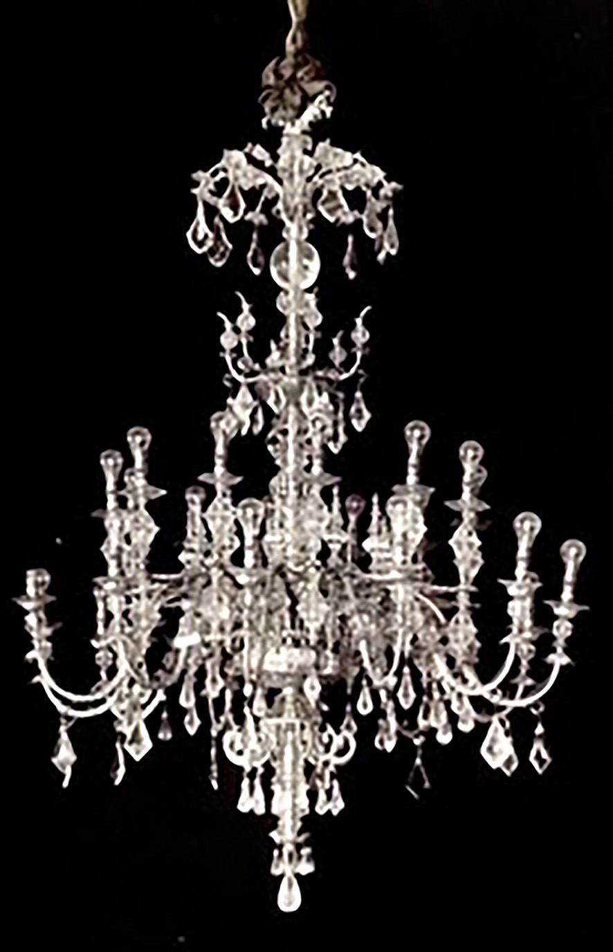 Ein nächster Durchbruch, den wir hoffentlich mit der Aufarbeitung der Produktion Egger und seiner Firma Tungsram datieren werden können, ist das Erscheinen der Kerzen-Glühlampe mit dem Edison Schraubsockel E-14. Die ermöglichte völlig neue Wege, bot aber nicht wirklich einen Beitrag zu wahren Geschichte der historischen Kristallluster. Hier ein Luster im Stil Kaiser Karl VI, das Foto zeigt frühe Kerzenlampen, oder eine Kopie eines Maria Theresia-Lusters mit diesen „Erfolgslampen“ aus dem Salon der Kaiserappartements.